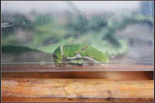 再仔細一看,果然被我找到元兇,一隻我小指寬度的五公分長青綠色毛毛蟲正在檸檬葉上享用大餐。往常遇到這種花園的不速之客,我都是將葉片剪下,連葉帶蟲的丟到樓下的大花圃中,眼不見為淨。那天福至心靈沒把蟲丟下,而是關進了飼養箱中,想給小孩觀察。