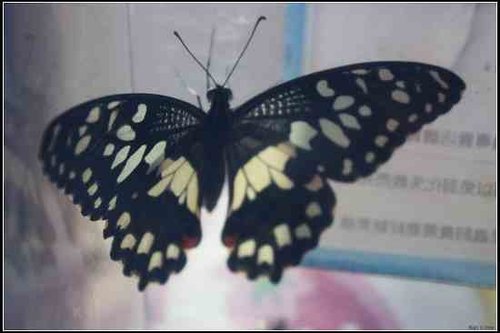 當天接小孩時,就提去給妮妮驚喜一下,同學都圍過來。我本來要帶去交大圖書館查圖鑑,沒想到黑熊般的老師就有一本不錯的蝴蝶書,還好我有看過牠小時後的樣子,否則花樣類似的蝴蝶有好多種,一時還不好辨認。哈!被我查到了,就是牠-無尾鳳蝶。