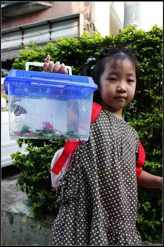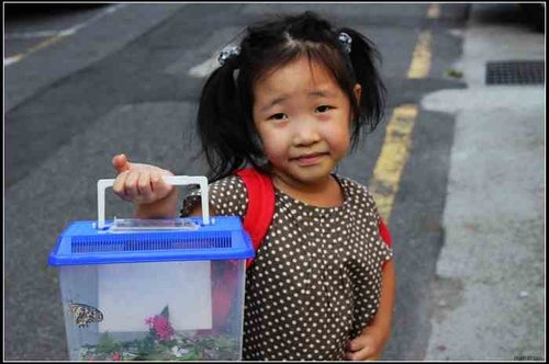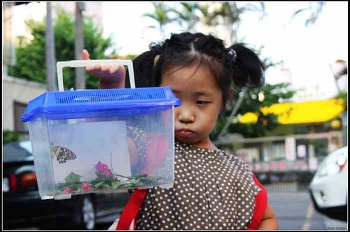 一開始妮妮還唸道:「為什麼每次抓到蟲都要我養起來呢?」,因為再上一週有類似金龜子的來下蛋兩次,我也把那些蛋給養起來,直到孵化出小蟲才放生,所以小孩大概覺得有點不新奇了吧! 不過養毛毛蟲是第一次,所以隔幾分鐘後她就把蟲當寵物似的一直跑去看。我則是補充一些新鮮的檸檬葉入養箱中。
