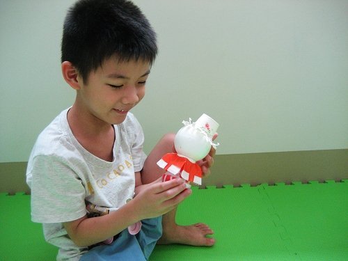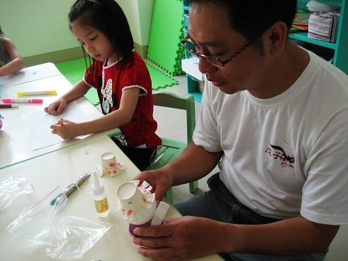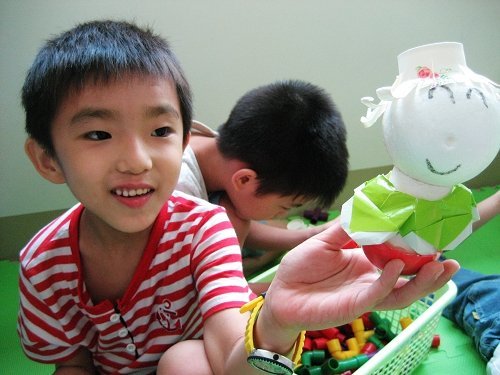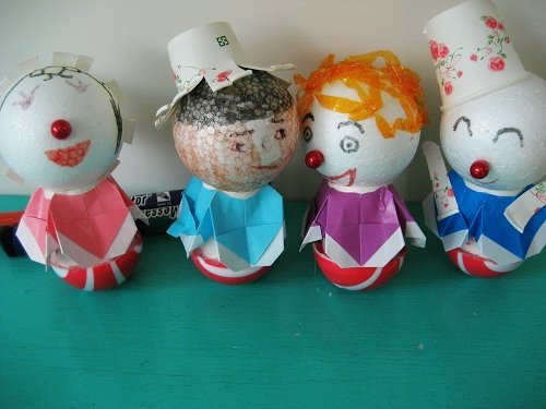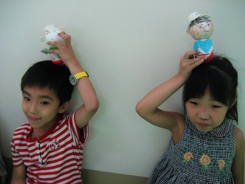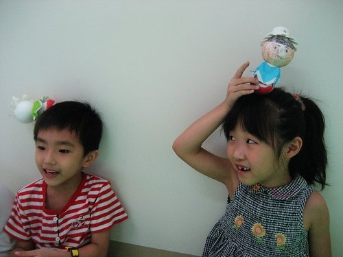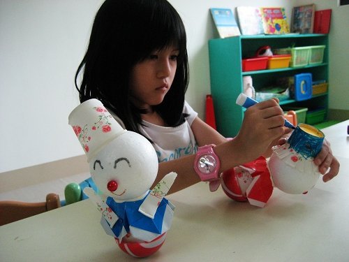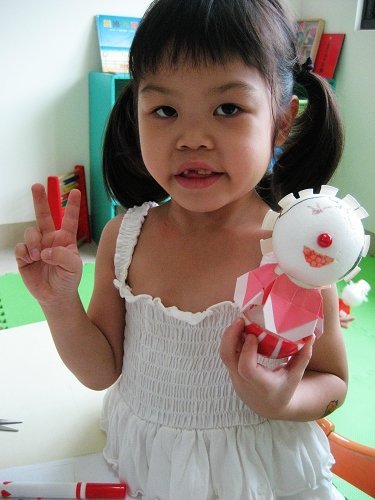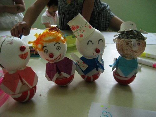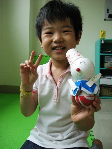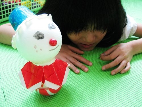 照老師的方法製作,這些娃娃的確是"推你倒下你又站起來"。 不過如果裝飾品分布得不平均,重量關係,小翁的身體會歪斜,這也讓孩子對平衡產生概念。