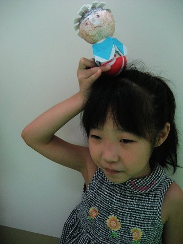 不倒翁做得好耶! 它被怎麼推就是不倒,這隻的表情特別高傲呢! 小主人甘拜下風