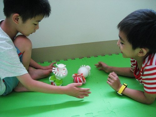 山羊叔叔替孩子準備了塑膠球、保麗龍球、陶土及裝飾品等,教他們製作"不倒翁"。